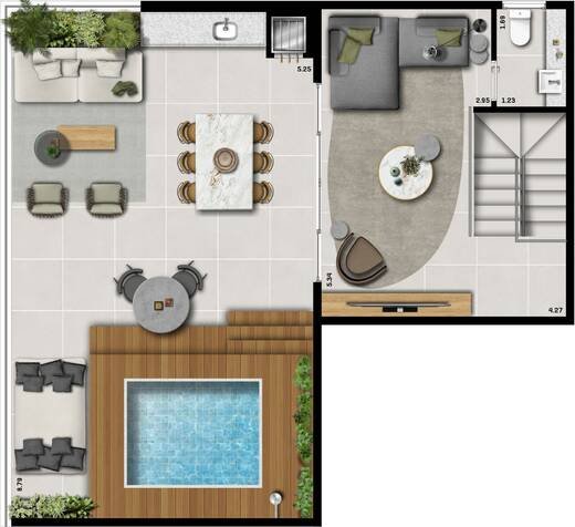 1 quarto, área externa com previsão de churrasqueira e piscina + 1 vaga de garagem.